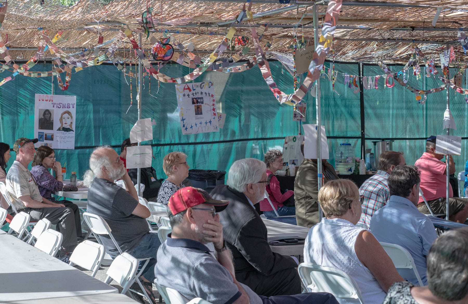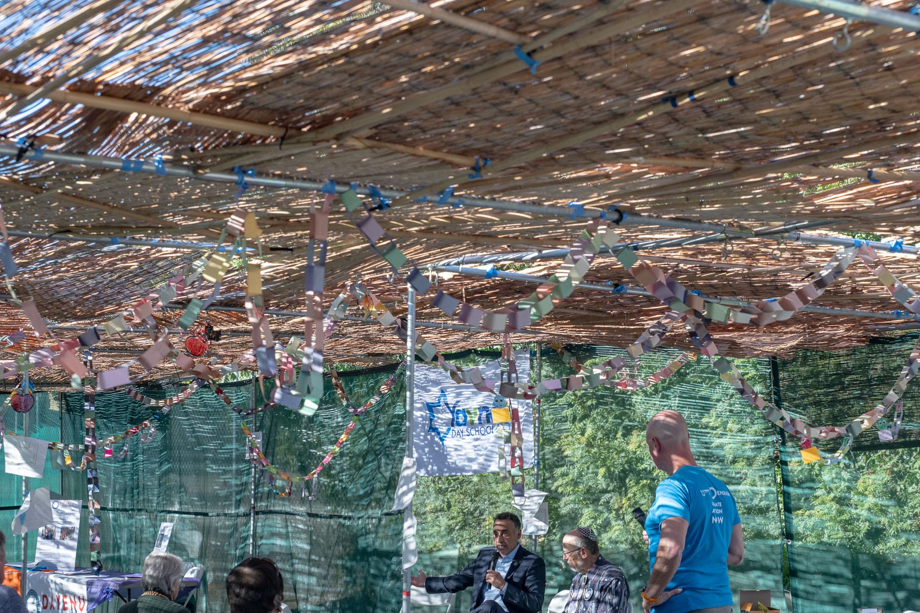 The sun showed up on October 12 in time to illuminate a community sukkah at Jewish Silicon Valley in Los Gatos, CA, where people gathered for a climate fair.
