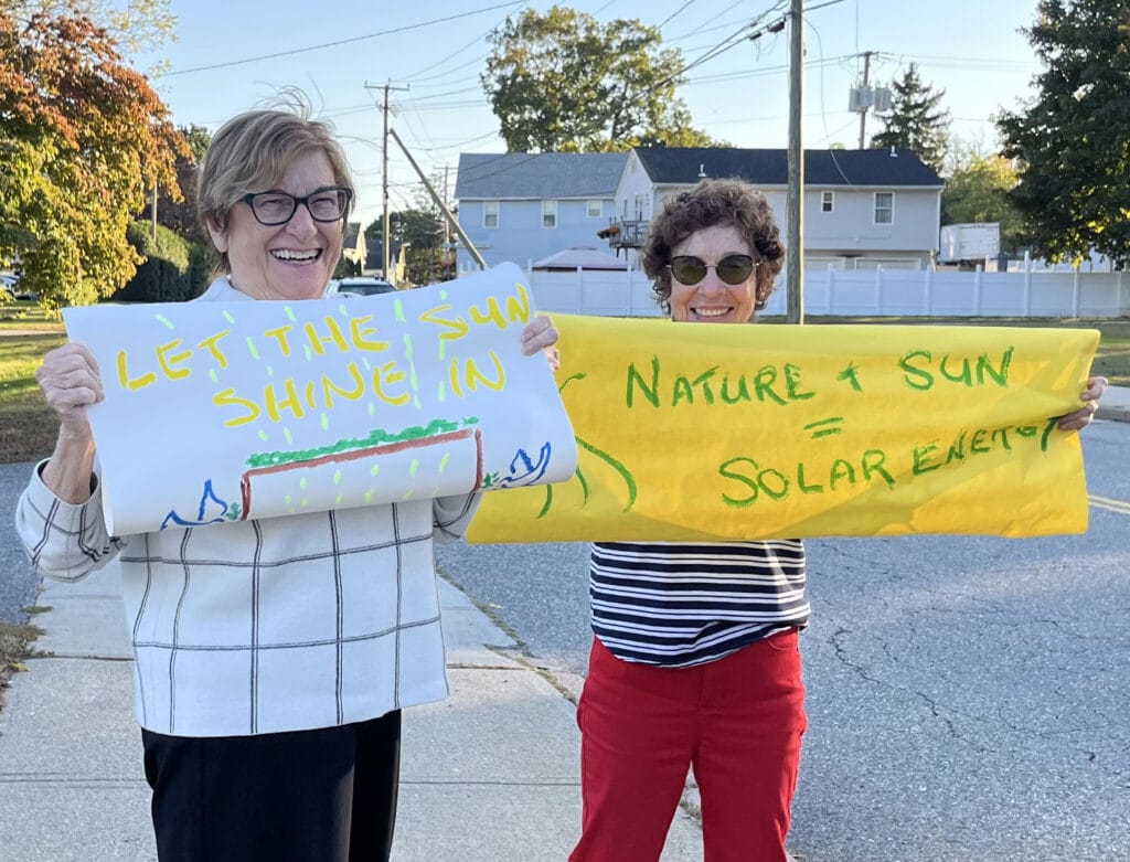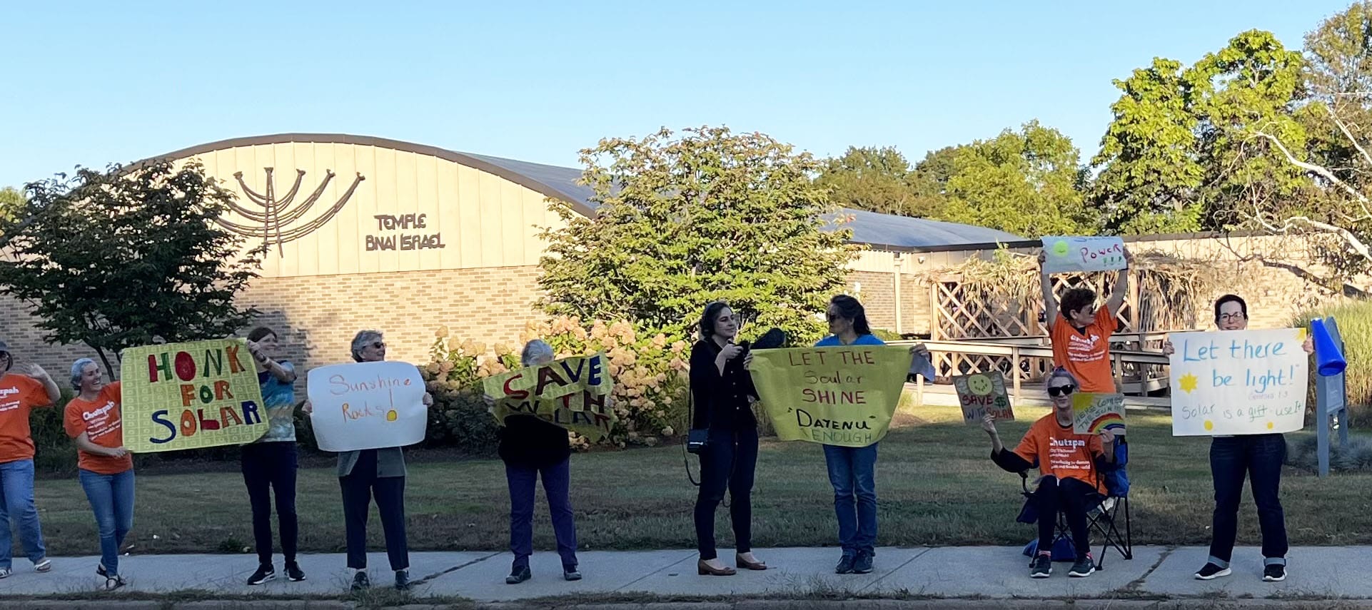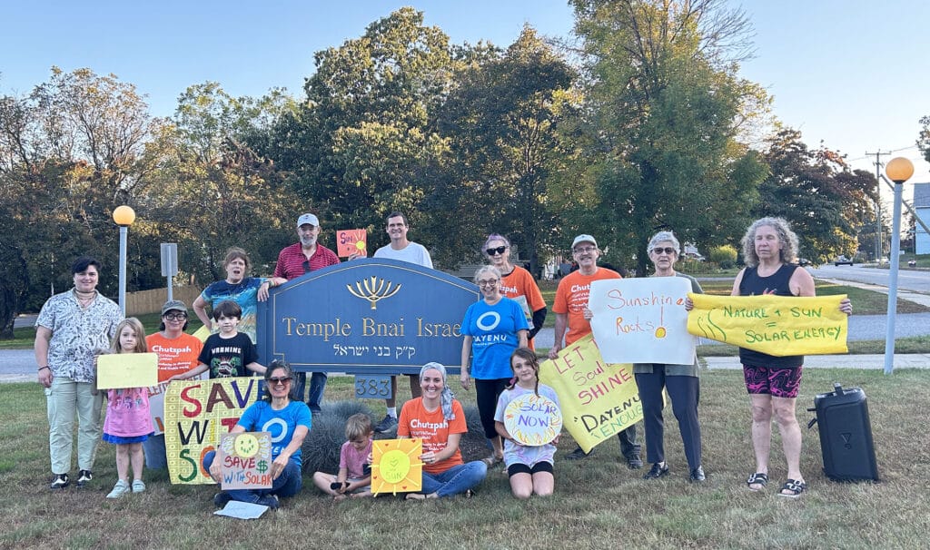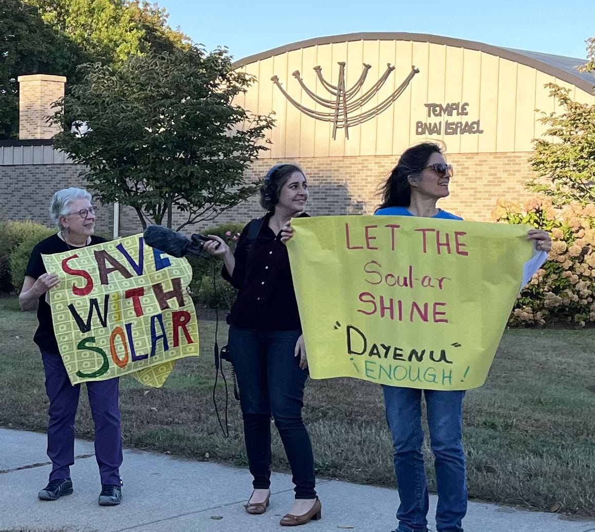 Then we headed outside our synagogue for our Sun Day rally. We chanted, sang (songs provided by Dayenu’s Rabbi Laura Bellows), and shared our joy about solar and clean energy to passersby. Since our building sits on a main thoroughfare in Willimantic, the event was quite visible! We were energized by a lot of honks and waves from pedestrians and drivers.