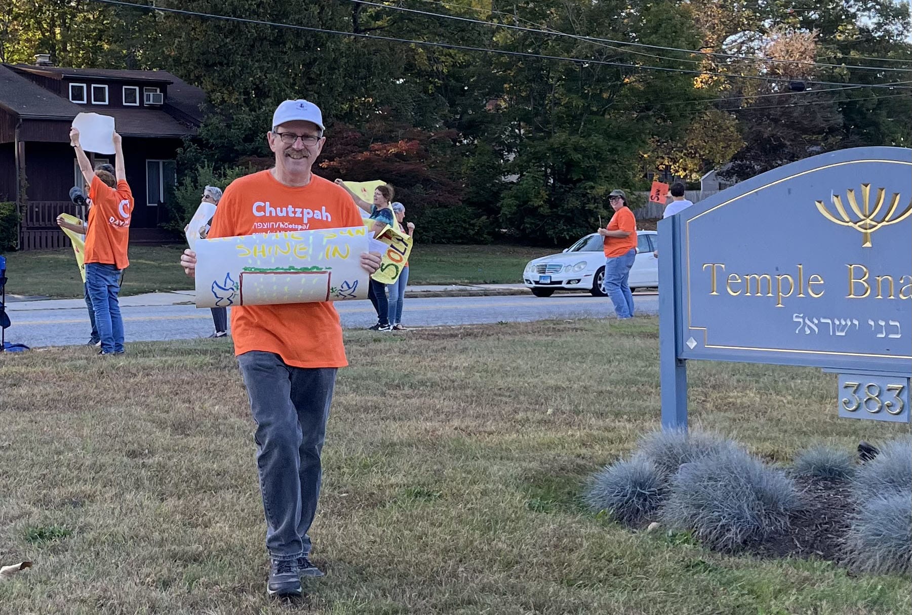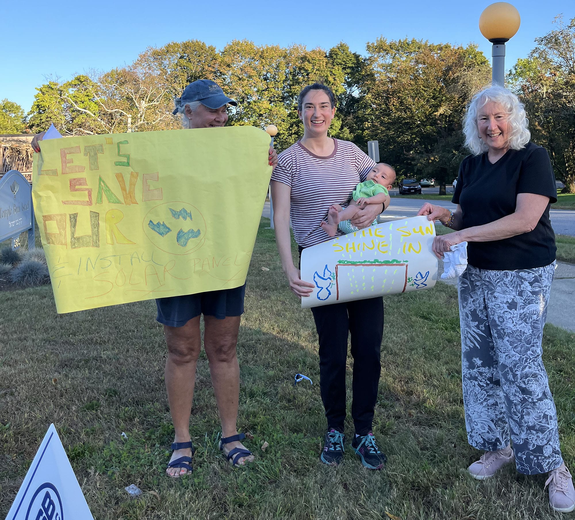 To start, around 20 people of all ages gathered in our synagogue’s sukkah to create signs and chat with a reporter from Connecticut Public Radio about why we are doing this work together and why this event. We talked about our connection to Dayenu and our commitment working towards a just, livable future with boldness and audacity (the Rabbi quoted from the Chutzpah T-shirt he was wearing!). (Stay tuned; the story will air in about a month.)